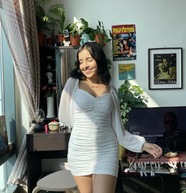Turn heads wherever you go with this stunning white ruched bodycon mini dress, designed to bring out your elegance and confidence. Made from soft, stretchable fabric, this dress hugs your curves perfectly while ensuring all-day comfort. The sweetheart neckline and sheer long sleeves add a romantic, modern touch—perfect for brunch dates, parties, or evening outings.
