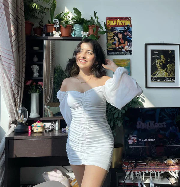 white ruched bodycon dress for women, mini dress for party, elegant white dress, stylish western dress for girls, women’s bodycon party wear, date night outfit, trendy white short dress, ruched mini dress online