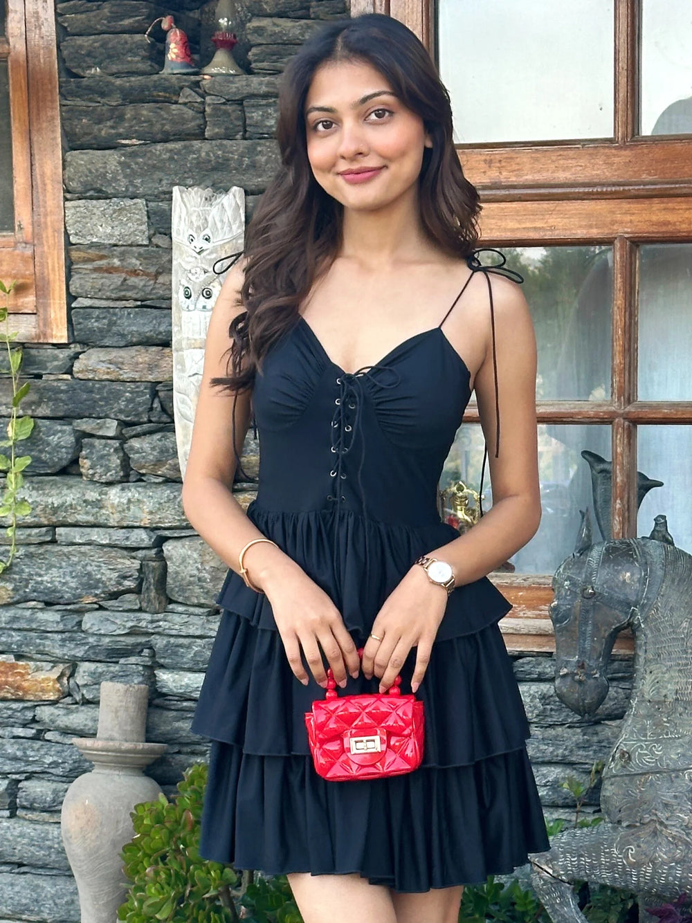 women black ruffle dress, layered short dress for women, spaghetti strap mini dress, lace up front black dress, party wear dress for girls, trendy western dress, casual short dress, sleeveless mini dress for women, stylish outfit for brunch and date night