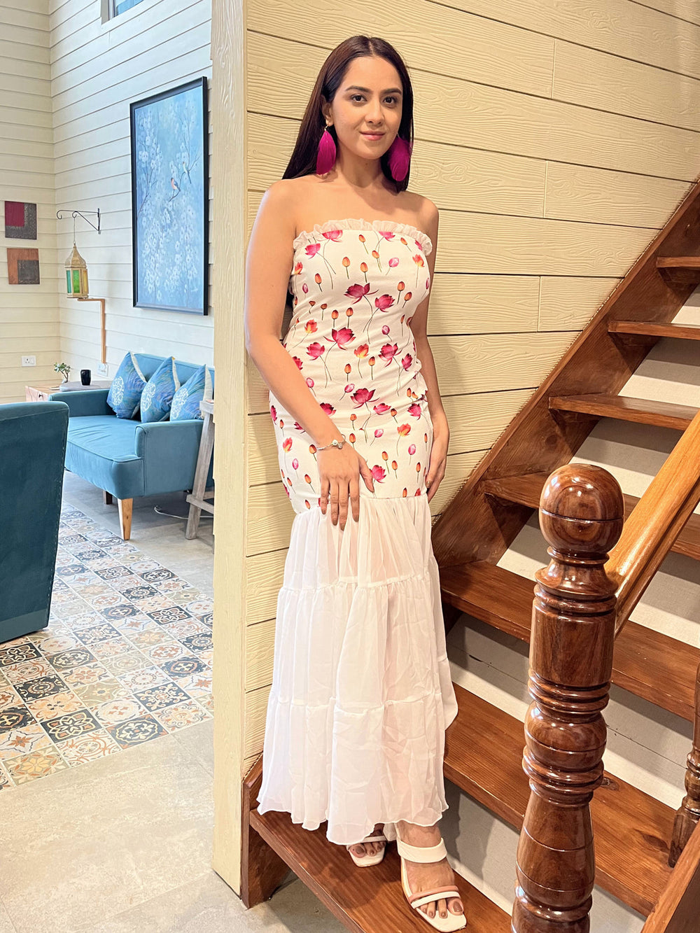 Graceful, feminine, and effortlessly elegant — the Ivory Bloom Strapless Floral Tiered Maxi Dress is designed to make a statement without trying too hard. Crafted in a soft ivory base with delicate pink floral prints, this dress beautifully blends romance with modern charm.