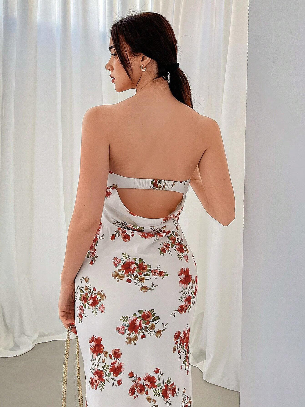 Floral midi dress, strapless dress for women, white floral dress, satin bodycon dress, party wear dress, elegant summer dress, Holy Women dress, trendy women’s outfit, brunch outfit, vacation dress, women’s floral clothing, floral tube dress